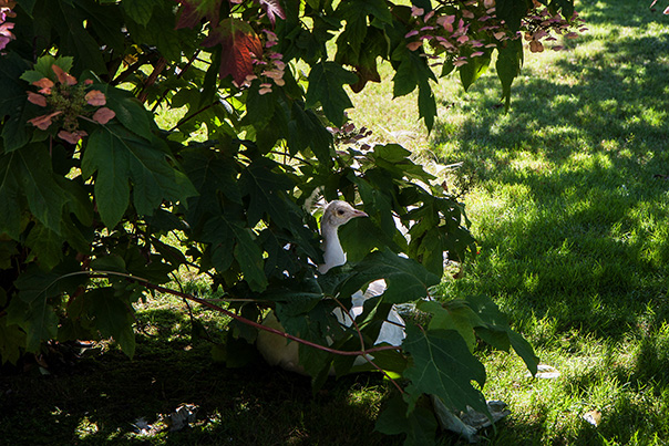 Dieser weisse Pfau sucht ein lauschiges Plätzchen im Schatten.(Aufgenommen am: 16.07.2017)