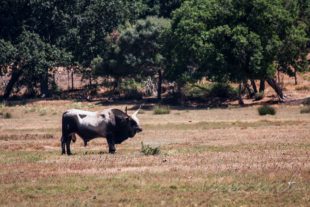 Die grossen Maremma-Rinder mit ihren beeindruckend langen Hörnern werden von einem nicht minder beeindruckenden Stier bewacht.(Aufgenommen am: 07.07.2017)